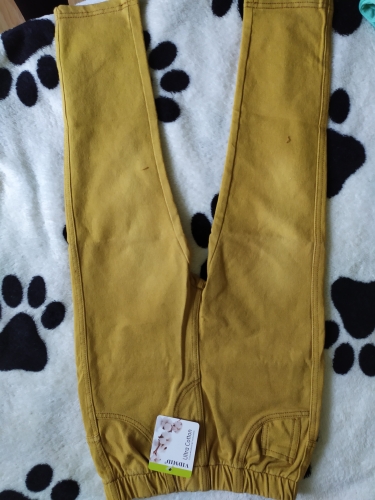 Delivery month. I order the second pants (the first took the color black). Soft, comfortable, look like jeans. Size 6 T-the whole length is 67 cm, the belt is about 25 cm, the elastic band freely stretches to-30 cm. Mustard color.