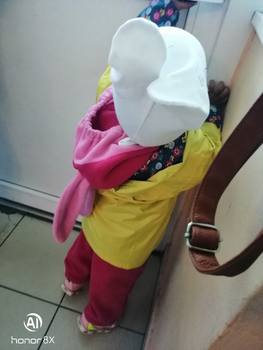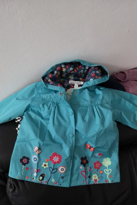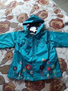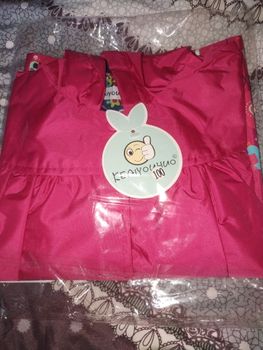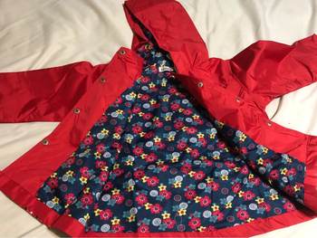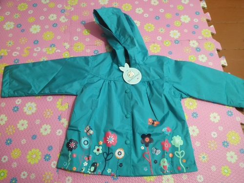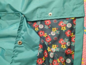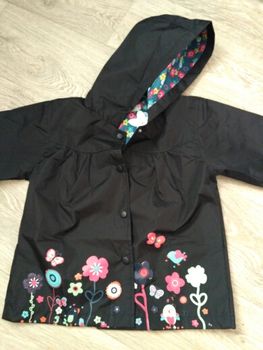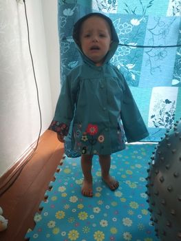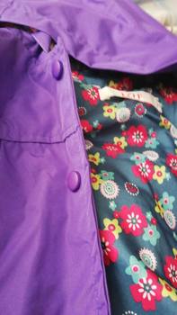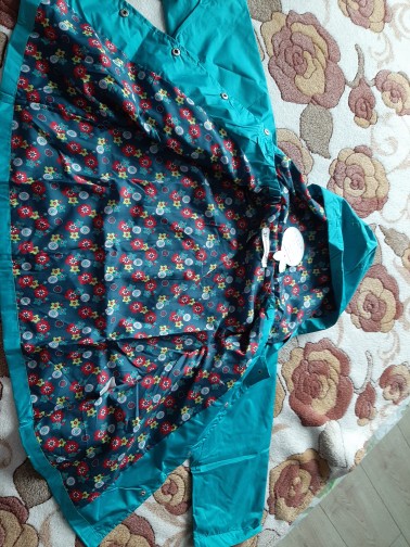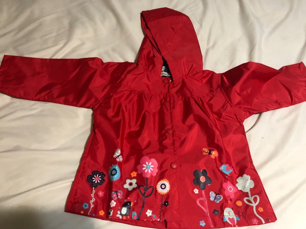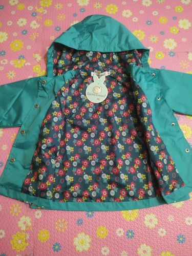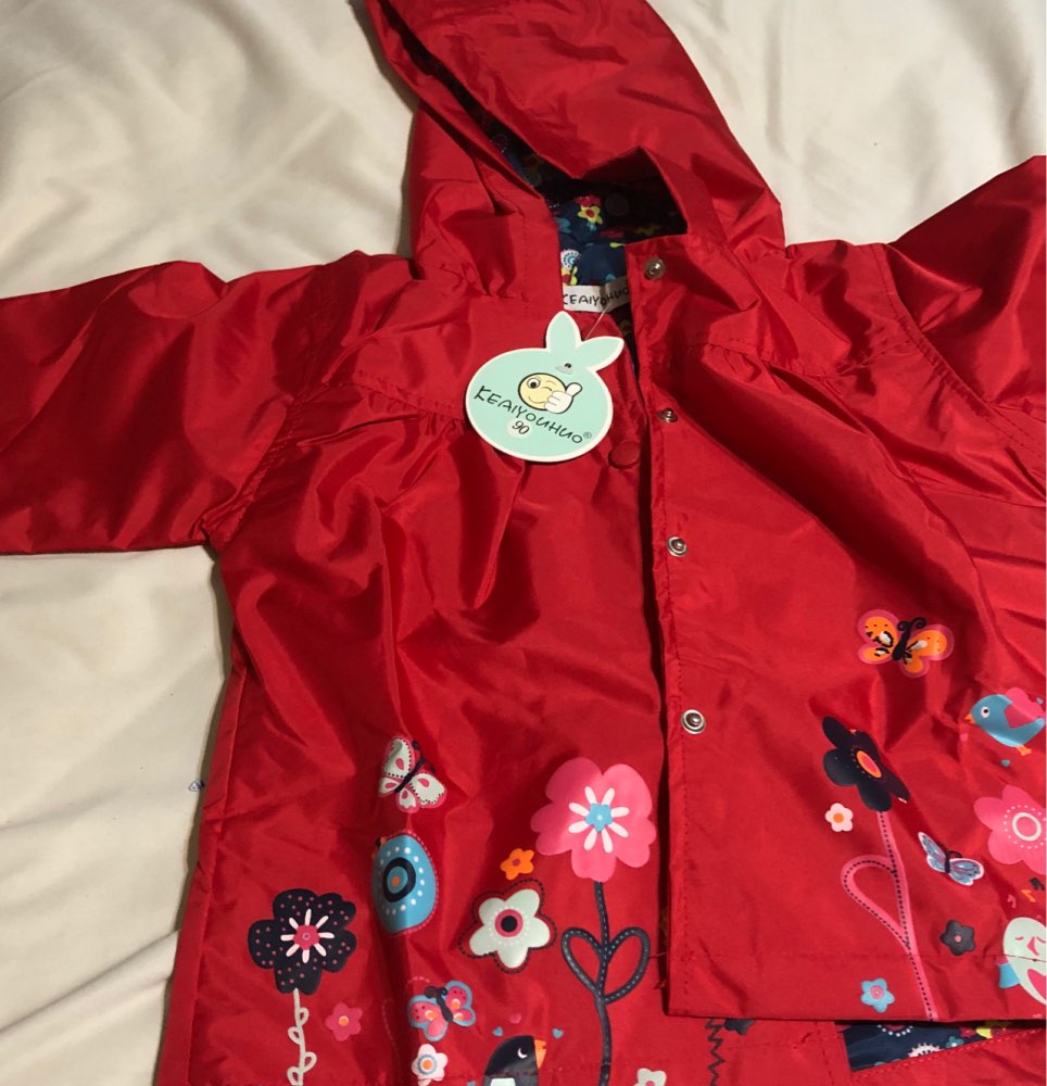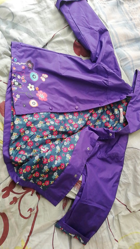 Delivery 2 weeks, very cute raincoat, but on warm weather, the height of 106 is slightly too long, but due to the cute lining, the half-creased look good
