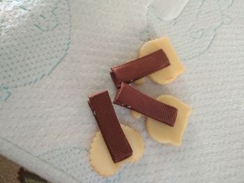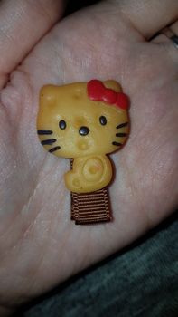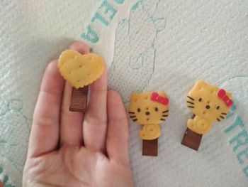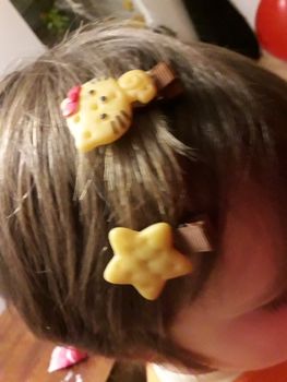 Slightly smeared with color, rather damp biscuit than baked and so very neatly done, there is no glue and smell, in the fabric both the upper part of the hairpin and the lower, so if the baby herself removes the hairpin, it does not scratch itself and will not tear out the hair