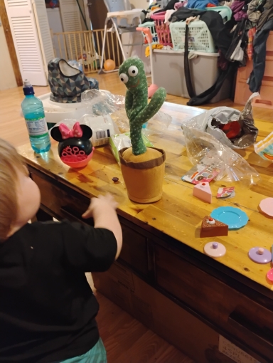 Baby boy loved his dancing cactus while sister had tea time with her tea set