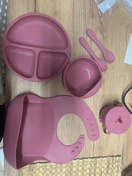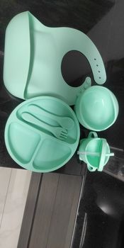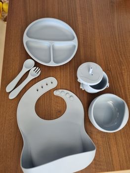 1.6pcs Self-Feeding Set:Our 6pcs baby feeding set accommodates all baby feeding stages, from purees to solid foods. It includes a bib with a food catcher, 1 x Silicone bowl 1 x Silicone bib 1 x Baby cup with straw and lid 1 x dinner plate 1 x Silicone spoon 1 x Silicone fork. Your baby will be an independent eater in no time!